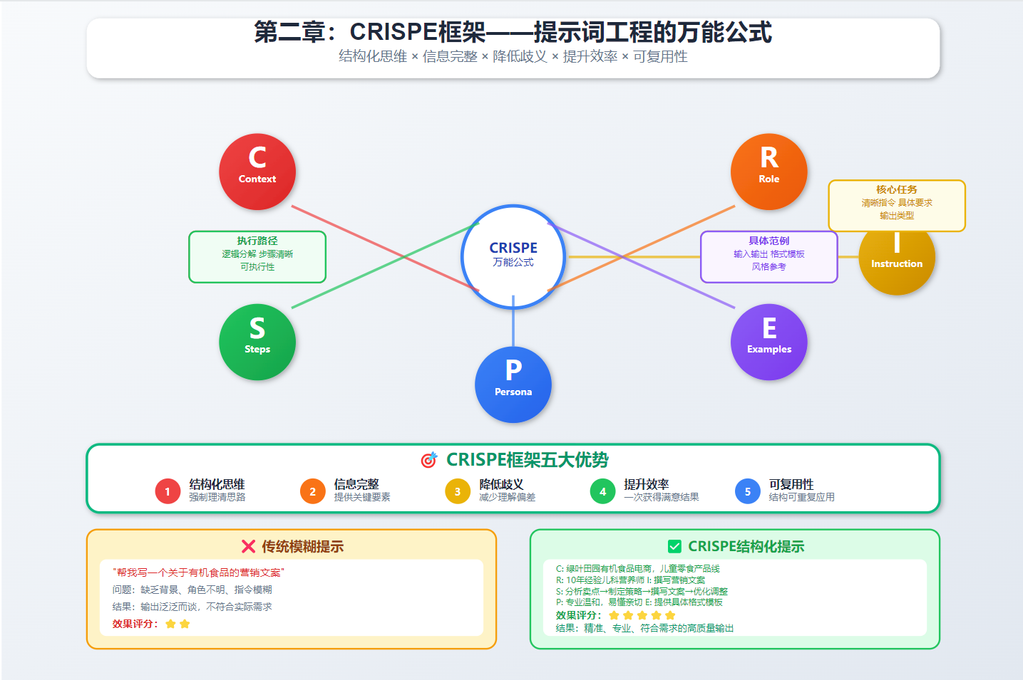 CRISPE框架是提示词工程领域最实用的结构化方法,它将复杂的需求分解为六个核心要素: