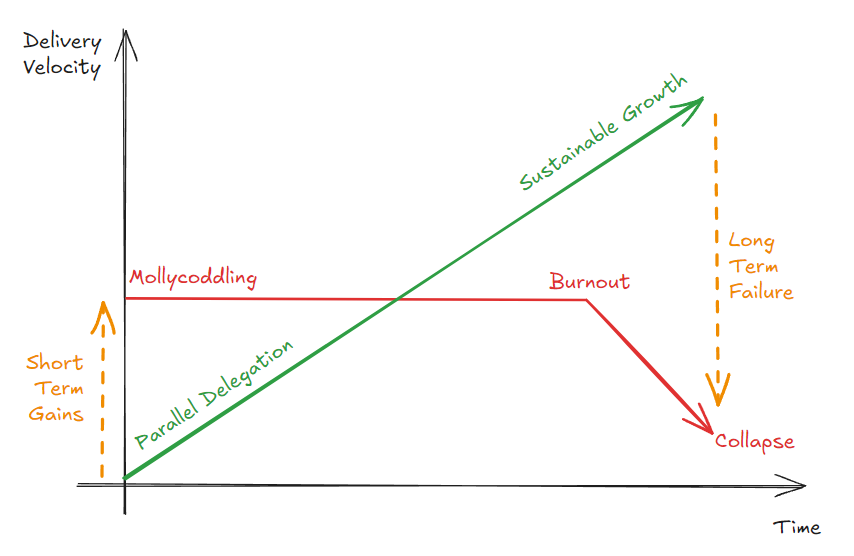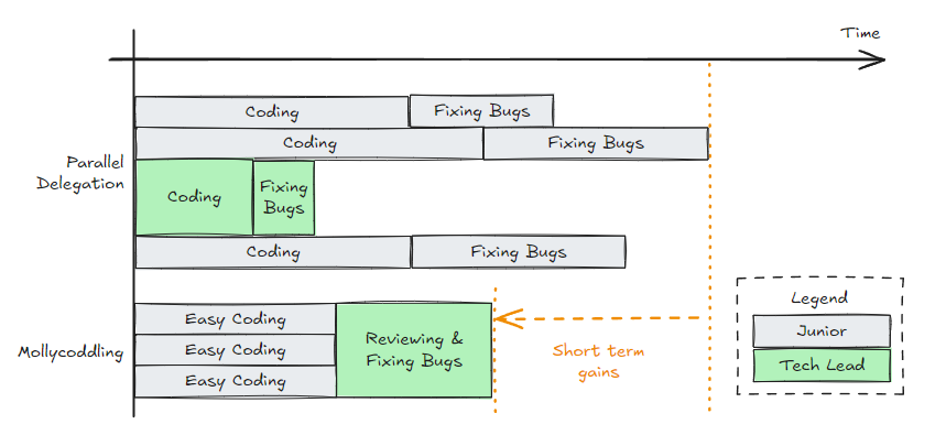 不幸的是,虽然我们将看到大包大揽对长期团队健康极其有害,但它通常也是加速交付的非常有效的方式。技术负责人的更高带宽通常通过承担所有最困难的工作来最有效地部署: