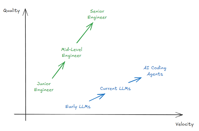 早期的LLM编写代码很快,但修复bug和消除幻觉所花费的时间意味着它们完成无bug代码的速度很慢。随着时间的推移,更智能的LLM以及更好地使用上下文工程和工具意味着现代AI编码代理在"一次性"编写代码方面要好得多。当前一代商用代理在生成可工作代码方面速度惊人,可以解决一些会挑战中级工程师的问题,尽管它们还无法匹敌高级工程师的专业知识。