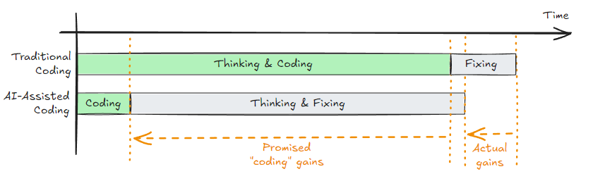 这就是营销文案中吹嘘的使用AI编写代码的范式转变速度(通常被描述为"快10倍"),与实际交付可工作软件时看到的边际生产力提升(通常接近10%)之间差异的根源。