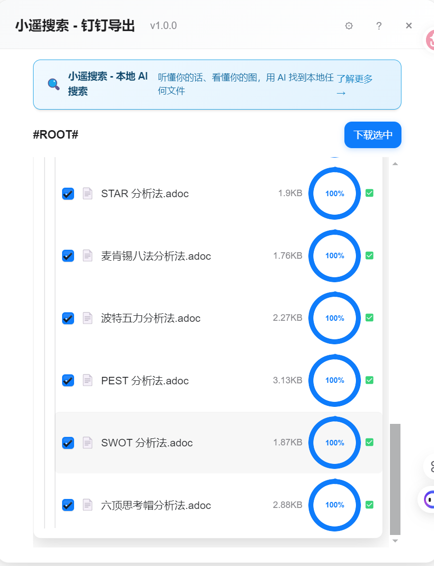 选择多个文档或文件夹,点击"下载选中"即可批量导出,实时显示导出进度。