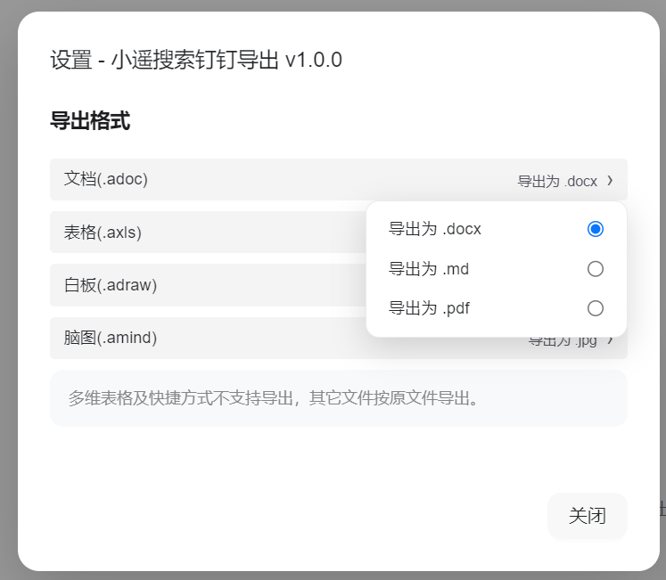 自定义各类文档的默认导出格式,支持 .docx/.md/.pdf/.xlsx/.jpg 等多种格式。